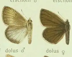 It is described in Seitz thus- L. dolus Hbn. (= lefebvrei Godt.) (81 f). male above with a light, silky, grey-blue gloss, nearly as in coridon, but this gloss is restricted to the outer half of the wing, the proximal half being a dirty brown. Female above dark brown with darker veins, resembling almost exactly a male of ripartii on the upperside. Underside rather similar to that of admetus, clearer, with smaller ocelli and without white mesial streak. In South France, and Northern and Central Italy. — ab. vittata Oberth. (81 f) [now P. d. vittata (Oberthür, 1892)] are specimens with a whitish mesial streak on the hindwing beneath; from the Cevennes (Lozere). — menalcas Frr. (= epidolus Frr.) (81 g) is a form from Anterior Asia (or a distinct species?) [now full species Polyommatus menalcas (Freyer, 1837) ] which has a paler underside, smaller ocelli and a very distinct sharply defined mesial streak on the hindwing beneath. In the male the brown colour of the upperside is restricted to the forewing and here concentrated into a dirty brown patch. Turkey and Asia Minor to Turkestan. Larva green when young. later on violet; until June on Onobrychis and Medicago. The butterflies from June till August, locally plentiful, especially flying on fields of Esparcet.[1]