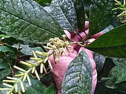 The inflorescence is a raceme (an unbranched spike) produced in the leaf axils or at the ends of branches. The cream/purple flowers are tubular, about 12 mm (0.47 in) long by 3 mm (0.12 in) wide. The fruit is a rounded or ovoid, dark purple or black berry containing a single seed. The fruit measures about 12 mm × 10 mm (0.47 in × 0.39 in) and the seed about 9 mm × 7 mm (0.35 in × 0.28 in).[5]: 158 [6][7][8]