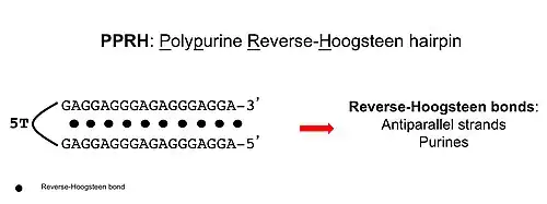 Polypurine reverse-Hoogsteen hairpins (PPRHs) are non-modified oligonucleotides containing two polypurine domains, in a mirror repeat fashion, linked by a pentathymidine stretch forming double-stranded DNA stem-loop molecules. The two polypurine domains interact by intramolecular reverse-Hoogsteen bonds allowing the formation of this specific hairpin structure.
