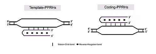 PPRHs can bind to polypyrimidine stretches in either single- or double stranded DNA by Watson and Crick bonds establishing triple-stranded DNA structures. The formation of PPRHs triplexes takes place at physiological pH. PPRHs provoke a strand displacement.[1] of the homopurine sequence of the target dsDNA, opening the two strands of the DNA. There are two types of PPRHs: i) Template-PPRHs[2] that bind to the template strand of DNA, inhibiting transcription; and ii) Coding-PPRHs[3] that bind to the coding strand of the DNA altering splicing. Both types of PPRHs decrease gene expression. PPRHs present high stability in serum and cells and show lack of immunogenicity not activating the innate inflammatory response.[4] PPRHs do not have off-target effects and do not show hepatotoxicity or nephrotoxicity.[5]