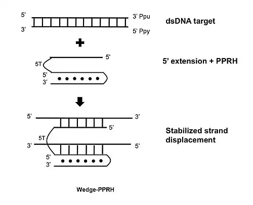 A further development consists in extending the 5' flank of the PPRH with a sequence complementary to the displaced polypurine strand of the target dsDNA which stabilizes the strand displacement, producing additional binding and functionality.[17]