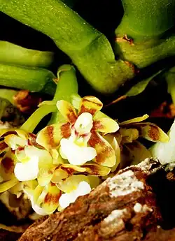 Pomatocalpa, commonly known as bladder orchids,[2] or 鹿角兰属 (lu jiao lan shu),[3] is a genus of about twenty five species from the orchid family, Orchidaceae. Plants in this genus are epiphytes or lithophytes with thick, leathery leaves and a large number of small flowers with a three-lobed labellum. There are about twenty five species found from tropical and subtropical Asia to the south-west Pacific.