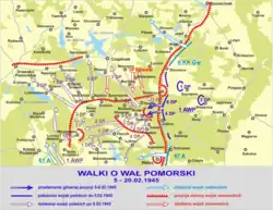 The advancing Soviet-Polish forces largely ignored the Pomeranian Wall's defences. The wall was first breeched by the Soviets at Hochzeit on January 28, and again at Baldenburg on February 26. Złotów, a town on the line, fell to the 4th Infantry Division of the 1st Polish Army on January 31.[6] Kolberg was surrounded by Soviet-Polish forces on March 4 and fell on March 18 after much of the military personnel and civilians in the city had been evacuated. The line did little to slow the Soviet advance.[3]