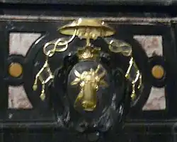 Arms: Or, a buffalo's head caboshed, sable, pierced with a sword, proper. Mantling: Sable, doubled Or. Crest: Out of a ducal coronet, an arm embowed in armor holding in its hand a sword, proper.