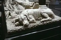 On the monument of William the Silent, at the Church of St. Ursula in Delft, Pompey is carved lying at his master's feet.[3]