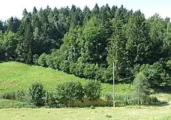 - Traces of the layout and wall of the ruins of St. Nicholas' Church are still preserved. This church was mentioned in written sources between 1570 and 1668, and was abandoned during the reforms under Emperor Joseph II. The discovery of Roman artifacts in the village indicates that the site was of early importance.[13]