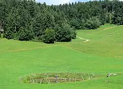 Ponikve is located on the western part of the St. Vitus Plateau (Slovene: Šentviška planota) or Šentviška Gora Plateau (Šentviškogorska planota) south of the Bača Ravine (Baška grapa). It lies on the road from Idrija pri Bači to Pečine to Slap ob Idrijci. Ponikve includes the hamlets and isolated farms of Lazi, Ostrožnik, Penček, Pri Puhu, Rob, Rute, V Grapi, Zagomilca, Zapušnik, and Za Vrhom. The village core lies in a basin surrounded by the following hills: Oblačno Brdo (755 meters or 2,477 feet), Pušnik (841 meters or 2,759 feet), Zadnik (713 meters or 2,339 feet), Gasilca (747 meters or 2,451 feet), Križ (723 meters or 2,372 feet), and Lepa Gorica (738 meters or 2,421 feet).[3] Penček Hill (Slovene: Penčkov grič, 912 meters or 2,992 feet) stands to the east, north of Penček. Intermittent Lake Rupa (surface area 0.12 ha, max. depth 2 m) lies north of the village. The lake is the source of an intermittent influent stream that disappears into a gorge at the end of the village, probably reemerging at Kresnica Cave above the hamlet of Potoka near Slap ob Idrijci.[3] In the eastern part of the village there is a small pond at Na Kalih northeast of Zagomilca, and Grahel Pond (Slovene: Grahelnova mlaka) lies on the extreme eastern edge of the village near Penček.
