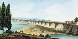 In 1235, a flood destroyed the bridge and monastic structures, leading a reconstruction by 1294. In 1325, the institution was granted to the Abbey of Fontevivo. Further floods continued to destroy attempts to bridge the river, leaving passage at the site at the mercy of boats. In 1816, Marie Louise, Duchess of Parma commissioned a permanent bridge. The structure was designed by Antonio Cocconcelli and his aide Giambattista Ferrari, with construction managed by Amedeo Rosazza. Inaugurated in 1821, in its day, the 600 meter bridge spanning 20 arches was considered a master feat of engineering.[1] It cost just over 2 million Lire at the time.[2] At each end of the span, sculpted by Giuseppe Carra, were and still are two flanking reclining statues, each representing the main rivers traversing the Duchy: Parma, Taro, Enza, and Stirone.[3]
