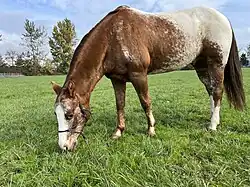 Ponies are only registered with the Pony of the Americas club if they have Appaloosa coloring visible from 40 feet (12 m), otherwise known as "loud" Appaloosa coloring. The coloration includes the typical leopard complex characteristics of mottling around the eyes, muzzle and genitalia, as well as visible white sclera of the eyes and striped hooves. Pinto coloration is not allowed, nor is ancestry from a breed noted for pinto coloring, such as the American Paint Horse. The facial profile of the POA is slightly concave. It is a muscular breed, with a deep chest and well-sloped shoulders.[1] The breed averages 11.2 to 14 hands (46 to 56 inches, 117 to 142 cm) high.[2] Despite having the size and name "pony", the breed has the phenotype (physical characteristics) of a small horse of an American Quarter Horse/Arabian type, not a true pony breed.[3]