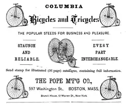 The Pope Manufacturing Company was an American manufacturer of bicycles, motorcycles, and automobiles. The company was founded by Albert Augustus Pope around 1876 in Boston, Massachusetts, and incorporated in Hartford, Connecticut, in 1877. Manufacturing of bicycles began in 1878 in Hartford at the Weed Sewing Machine Company factory. From 1905 to 1913, Pope gradually consolidated manufacturing to a plant in Westfield, Massachusetts, while the main offices remained in Hartford. The company ceased automobile production in 1915 and ceased motorcycle production in 1918, and subsequently underwent a variety of changes in form, name and product lines. Its Columbia brand of bicycles, first marketed in the late 1870s, continues to be actively sold.