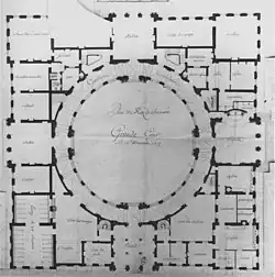 The extant plan shows a square entrance vestibule with 16 columns: four free-standing, and the remainder engaged with the walls. The vestibule leads to the circular gallery, on the opposite side of which is a doorway leading into the main domed salon on the garden front. To the left of the salon is the elector's apartment arranged as an enfilade of grande salle, chambre d'audience, chambre à coucher (bedroom), and a cabinet. To the right of the salon is the salle à manger (dining room). The chapel is located in the center of the right wing, while the right front quadrant houses the kitchens and the concierge, and the left front quadrant, the stables. Minor rooms, stairs, and a loo occupy the corners between circular gallery and the main rooms in the garden side, and the corresponding spaces on the entrance side provide courtyards for the kitchens and the stables.[1]