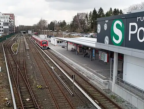 Poppenbüttel (German pronunciation: [ˈpɔpɛnbytɛl]) railway station is on the Alster Valley line and is served by the rapid transit trains of the Hamburg S-Bahn.[3]