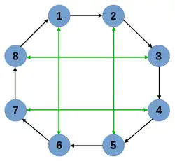 Example of an island model consisting of eight islands and two neighbourhood structures: a simple unidirectional ring (black arrows) and a more complex structure (green and black arrows)