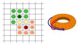 A commonly used structure for arranging the individuals of a population is a 2D toroidal grid,[17][1][2][15] although the number of dimensions can be easily extended (to 3D) or reduced (to 1D, e.g. a ring,[6][15] see the figure on the right). The neighbourhood of a particular individual in the grid is defined in terms of the Manhattan distance from it to others in the population. In the basic algorithm, all the neighbourhoods have the same size and identical shapes. The two most commonly used neighbourhoods for two-dimensional cEAs are L5 and C9, see the figure on the left. Here, L stands for Linear while C stands for Compact. Each deme represents a panmictic subpopulation within which mate selection and the acceptance of offspring takes place by replacing the parent. The rules for the acceptance of offspring are local in nature and based on the neighbourhood: for example, it can be specified that the best offspring must be better than the parent being replaced or, less strictly, only better than the worst individual in the deme.[2][6] The first rule is elitist and creates a higher selective pressure than the second non-elitist rule. In elitist EAs, the best individual of a population always survives. In this respect, they deviate from the biological model.