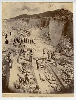 The name derives from the port city of Porbandar from where it was shipped to Bombay and other cities, and does not refer to the stone quarried in the city itself; there have been instances of the city stone, considered inferior to the original, being passed off as the genuine 'Porbandar' stone.[6] In addition to Bombay, the stone also appears in prominent buildings of Madras and Cochin.[7] The stone was highly prized by sculptors and architects, and during 1917-18 around 32,420 tonnes was sent outside the state to Calcutta, Madras, Karachi and Rangoon.[8]