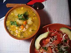 Porotos granados is a traditional Chilean countryside stew made mainly of ripe cranberry beans,[1] maize kernels and squash. Other common ingredients are onions, and herbs such as cumin, basil and oregano. Pumpkin is also used in some recipes. It is considered a summer stew, because that is when the maize and summer squash are harvested in central and southern Chile.[2]