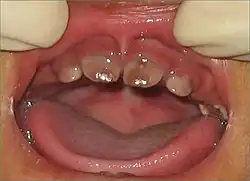 Günther disease is a congenital form of erythropoietic porphyria. The word porphyria originated from the Greek word porphura. Porphura actually means "purple pigment", which, in suggestion, the color that the body fluid changes when a person has Gunther's disease.[3] It is a rare, autosomal recessive[4] metabolic disorder affecting heme, caused by deficiency of the enzyme uroporphyrinogen cosynthetase.[5] It is extremely rare, with a prevalence estimated at 1 in 1,000,000 or less.[6] There have been times that prior to birth of a fetus, Gunther's disease has been shown to lead to anemia. In milder cases patients have not presented any symptoms until they have reached adulthood. In Gunther's disease, porphyrins are accumulated in the teeth and bones and an increased amount are seen in the plasma, bone marrow, feces, red blood cells, and urine.[7][8]
