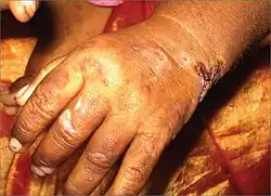 Though expressivity is varied depending on the mutation responsible for decrease in enzyme function, severe cutaneous sensitivity is present in most cases of this Porphyria. An estimated 30–40% of cases are due to the C73R mutation, which decreases stability of the enzyme and results in <1% of its activity.[9] Exposure to long-wave ultraviolet light causes the affected skin to thicken and produce vesicles that are prone to rupture and infection; these secondary infections, along with bone resorption, can lead to disfigurement of the sun-exposed face and extremities.[10] Enzyme dysfunction prevents the normal production of heme and hemolytic anemia is another common symptom, though a lack of hemolysis in this disease is possible. Porphyrins additionally accumulate in the bone and teeth, resulting in erythrodontia.[10][11] When unexpected attacks occur, abdominal pain, as well as vomiting and constipation commonly follow the attacks. Exposure to the sunlight can cause discomfort and result in blistering, consciousness of heat, and swelling and redness of the skin.[12]