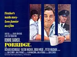 Porridge (American title: Doing Time) is a 1979 British comedy film directed by Dick Clement and starring Ronnie Barker, Richard Beckinsale, Fulton Mackay and Brian Wilde.[4] It was written by Clement and Ian La Frenais based on their BBC television series Porridge (1974–1977). Most of prison officers and inmates from the original series appear in the film, with the notable exceptions of Lukewarm, Blanco, Heslop, and Harris. There is also a different governor, played by Geoffrey Bayldon rather than series regular Michael Barrington.