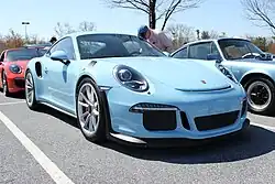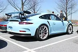 The Club Coupe was introduced to celebrate the 60th anniversary of the Porsche Club of America. Just 60 Club Coupes were produced for the 2016 model year.[7] Notable changes from the standard GTS include 20" alloy wheels (the same as those found on the 2014 50th Anniversary Edition) which pays homage to the "Fuchs"-style wheels on classic 911s, special "Club Blau" exterior paint,[8] SportDesign bodywork, and a "ducktail"-style spoiler which references classic motorsports-oriented 911s, for example the Carrera RS 2.7. The interior features Club Coupe-specific dashboard trim, door sills, and centre console lid.[9]