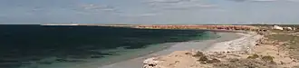 Port Gibbon consists of land on the coastline with Spencer Gulf which extends from a headland called Point Gibbon (formerly Point Price) in the south for a distance of about 5 kilometres (3.1 mi) along the southern end of an unnamed bay whose northern end terminates at a headland called The Knob in the adjoining locality of Cowell. The coastline consists of a series of beaches backing onto a cliff line of “red bluffs composed of Pleistocene alluvium” with heights up to 10 metres (33 ft). A settlement is located at the middle of the bay behind the cliff line. A road runs along the coast both south and north of the settlement.[11][12][13]