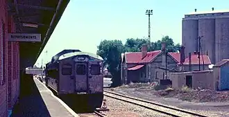 The wooden station building was opened in 1876 at the terminus of the lightly engineered, 1067 mm (3 ft 6 in) gauge railway from Port Pirie – then a town of fewer than 1,000 people – into the rich agricultural hinterland of the Mid North. The need was to transport agricultural produce more cheaply to the port for export, mainly to Great Britain, in sailing ships.[1]: 27 The following year, Port Pirie's inaugural railway station was opened. A modest weatherboard building, it was placed at the north end of the railway yards, about 250 metres (270 yards) from the town's wharves.[2] In addition to the building there were two locomotive sheds and a freight shed, coaling and watering facilities, a passing loop in front of the station building, and a few sidings.