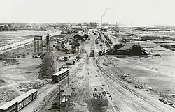 Since the railway was such an advance over horse-drawn wagons or bullock drays over unmade roads, traffic soon increased significantly, especially when in the following year the line reached the nearest town in the hinterland – Gladstone, 52 km (32 mi) east of the port – and, more so, Petersburg,[note 2] a further 64 km (40 mi) east, in 1881.[3][4] In the years that followed, more trackage was constructed in the yards to accommodate the increased tonnages and variety of freight. The yards eventually became known as "Port Pirie South Yard", then many years later, "Pirie Main Yard".[1]: 27 [note 3]