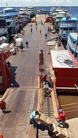 The Port of Manaus is a riverport located on the Rio Negro in Manaus, Amazonas, Brazil. The Port of Manaus is an important commercial center for ocean-going vessels traveling the Amazon. In fact, it is the main transport hub for the entire upper Amazon basin. It imports beef from the hinterlands and exports hides and leather. Important industries in the Port of Manaus include manufacturing of soap, chemicals, electronics equipment as well as shipbuilding, brewing, and petroleum refining.