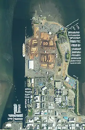 The Marine Terminal spans over 60 acres (24 ha)[1] on the port's approximately 200-acre (81 ha) holdings in south Puget Sound. It includes a terminal for cargo containers with 23 acres (93,000 m2) of storage space and 25 acres (100,000 m2) of commercial space.[10] Handling various types of cargo such as timber and wind energy equipment, the terminal contains three deep water berths, a rail line on the dock, a U.S. Customs bonded warehouse, and a "specialty cargo" container yard.[1]
