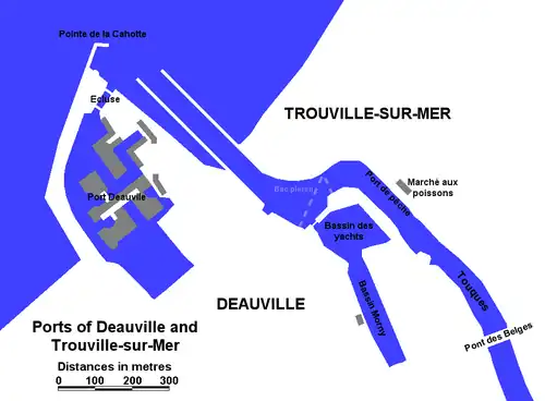 The docks of Trouville constitute a district within the city. It is situated on the River Touques, along the Boulevard Fernand Moureaux and downstream from the Pont des Belges. The main building on the docks is the fish market (marché aux poissons).