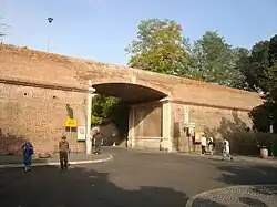 Post-war modifications included the removal of a travertine block with a fascist emblem.[1] In 1961, the area outside the gate along Viale Ximenes was turned into a public park.[3] In 2002, with the transformation of Grosseto's historic center into a limited traffic zone, Porta Corsica became the sole vehicle access point to the center, equipped with an electronic gate installed in 2008.[4]