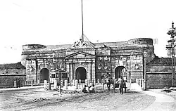 To accommodate increasing civilian traffic, the right-hand arch (from the exterior perspective) was opened in 1854, followed by the left-hand arch in 1900. These renovations involved some demolition of the 16th-century structure. In the interior façade, the new openings replaced the windows of the side rooms,[19] originally intended for the guardhouse, although the left room still retains a large fireplace.[22] During this same period, the double flight of internal stairs leading to the roof and artillery emplacements was demolished.[19]