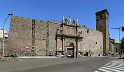Porta Romana is a southeastern portals in the medieval walls of Viterbo. The merlionated gate, with Baroque decoration is located on at exit point of Via Garibaldi, where it meets highway SS2 as it skirts the historic center of Viterbo, region of Lazio, Italy. South of the gate is a train station (Stazione di Viterbo Porta Romana), with local lines linking to Rome, and just west is the campus of Tuscia University, which occupies some of an old Dominican monastery and Villa Gentili. Just north inside the walls, is the church of San Sisto.