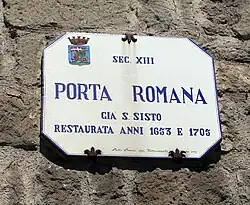 This gate, as seen from outside the walls, was built in 1649 by Francesco Maiolino. The walls at this point are decorated by Ghibelline (swallow-tail shaped) merlons. It replaced the Porta San Sisto, which is now incorporated into a tall tower to the right of the door, that serves as a bell-tower for the church. An epigraph above the gate, dated 1705, credits the then governor of the province, Marcellino Albergotti, with decorations. Facing outward, above the portal is a depiction of the youthful Santa Rosa of Viterbo, patron saint of the town. The statue is flanked by the coat of arms of Pope Clement XI and Pope Innocent X. The gate at the time was named Porta Pamphilia, or Innocenziana, because it was inaugurated in 1643 when Pope Innocent X Pamphili came to visit his sister-in-law Olimpia Maidalchini. The gate is now called Romana because it is on the road that led to Rome.[1]