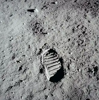 Boot print pictured by Buzz Aldrin during the Apollo 11 mission. Initially used to study the mechanical properties of lunar soil, it became one of the iconic images of the Apollo era.