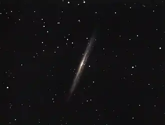 NGC 5907 is a spiral galaxy located approximately 39 million light years from Earth. It has an anomalously low metallicity and few detectable giant stars. The galaxy was discovered in 1788 by William Herschel. Supernova 1940A is in this galaxy.