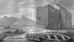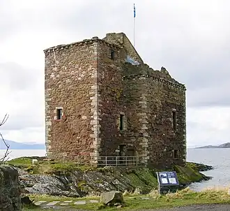 In the castle's earliest days, it was known as "Arneil" (alternatively spelled "Arnele" or "Ardneil") and was held by the de Ross family. After the victory over the English at the Battle of Bannockburn in 1314, King Robert the Bruce gave the estate to Sir Robert Boyd of Kilmarnock a year later. Replacing a small castle on Auld Hill, Portencross castle was rebuilt in the mid- to late-14th century on a rock promontory at the bottom of Auld Hill, overlooking the Firth of Clyde by Boyd's grandson, also named Robert Boyd.[3] It served as the caput of the Barony of Ardneil.[4] From this location, King Robert II probably signed 15 charters dated at Arnele between 1371 and 1390.[3]