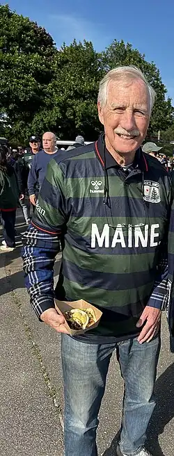 Senator Angus King in a Hearts of Pine "Woods & Water" jersey at a match in 2025.