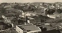 Founded in Sellwood, Oregon, in 1901, the Portland Woolen Mills relocated to the town of St. Johns in 1904 after a fire destroyed their old factory.[1][2] Their old factory was a total loss, costing them US$150,000 (US$5,249,444 adjusted for inflation).[3] The property the new factory was on consisted of four buildings over five acres of land. The main factory was a 100 ft. by 200 ft. brick and concrete two-story. Other buildings on the site included a 45 ft. by 50 ft. boiler and engine room and a 40 ft. by 100 ft. wool weaving warehouse. The total cost of the new St. Johns plant was US$600,000 (US$20,997,778 adjusted for inflation).[4] The company reportedly turned a US$300,000 (US$10,498,889 adjusted for inflation) profit in 1906.[5] In 1911, a female worker was critically injured when she got caught in a belt which caused her to be hit in the head by the machinery.[6]