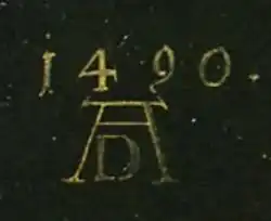 The father panel is signed and dated on both sides, in what may be the oldest extant instance of Dürer's signature monogram of a large open A and small d.[26] However this inscription and the 1490 date are later additions.[35][36] The Florence canvas is in relatively poor condition: retouching has largely removed Dürer's top layer of brushwork and left the paint hard and dry.[26] Barbara's panel underwent a restoration in 1974, when the surface was cleaned and partially revarnished, with repairs to damage on the reverse sustained from woodboring.[7]