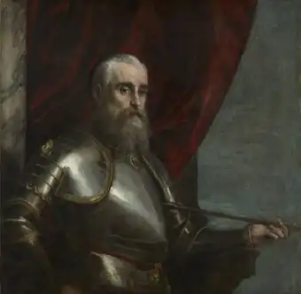 Its subject is Agostino Barbarigo, admiral of the Venetian fleet in Lepanto. In the famous naval battle, Barbarigo was killed by an arrow, an event alluded to by the dart that the Venetian admiral is holding in his hand. He wears an armor and appears in a thoughtful pose. The red drapery behind him can be interpreted as an allusion to his death,[2]