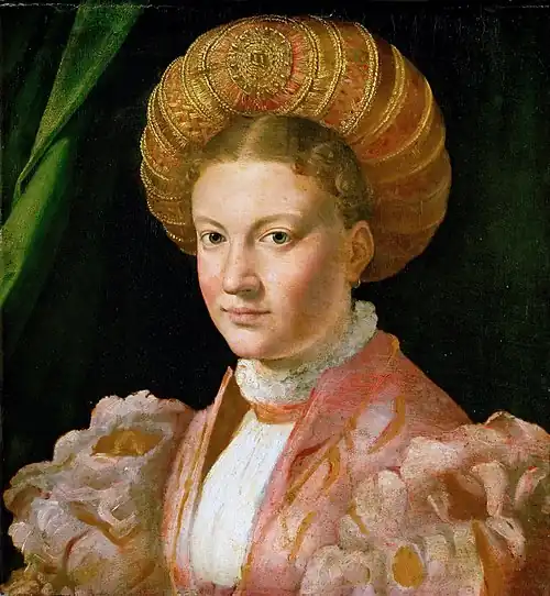 Against a dark background a young woman gazes at the viewer, dressed in a pink dress with slashed sleeves, after the fashion of the time. It is open at the front to shows a modest white undershirt called a guimp, held together at the neck with a ribbon in the same color of the dress. On her head she is wearing a donut-shaped turban called a balzo with gold embroidery, after a fashion then popular in Italy of the 1530s that is similar to his Turkish Slave, or Titian's Portrait of Isabella d'Este created between 1534 and 1536.[2]