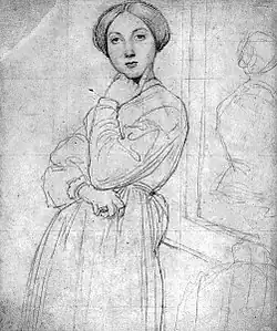 Ever contrary, Ingres later complained that he was unhappy with de Broglie's final portrait and that he had failed to fully capture her charms.[2] He was relieved when the portrait was met with approval from her family, writing that "family, friends, and above all the loving father [the duc de Broglie] were delighted with it. Finally to crown the work, M. Thiers —and I was not present—came to see it with the subject and repeated to her several times this wicked remark, 'M Ingres must be in love with you to have painted you that way.' But all this does not make me proud, and I do not feel that I have conveyed all the graces of that charming model."[6]