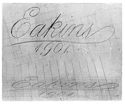 "Several months were thus consumed; then came the day, as we discovered through the convenient knotholes, when another perspective drawing was made and transferred to the canvas, on the floor and to one side. The letters spelled Eakins. The name was not familiar to us."[4]