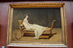Madame Juliette Récamier was a Neoclassical French icon, salon hostess, and influential Parisian socialite in elite French circles of the time. Wife of a French banker and daughter of a banker from Lyon, she was considered to be among the most beautiful socialites of her time. She was rarely seen without an entourage of male suitors.[5] and was renowned for both her wit and romantic affairs. The esteemed French poet and dramatist Théophile Gautier wrote of her "indescribable attraction, like the poetry of the unknown".[6] Prominent authors, such as Mme. de Stael, modeled some of her protagonists on Récamier.