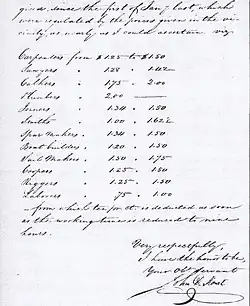 On November 2, 1842, Commodore John Drake Sloat responded to a request by Navy Secretary Abel P. Upshur for information about wages and working hours at the shipyard. Sloat said the "time of work is from sunrise until sunset, except when the sun rises before 7 o'clock or sets after 6 when they commence work at 7 and quit at 6 o clock, not exceeding 10 hours labor at any season of the year." He added that wages "are always fluctuating according to the demand for mechanics".[8]