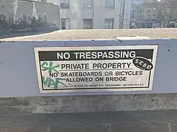 No major renovations have been done to the bridge itself since its erection. However, several minor changes have been made. For example, a metal gate was built on the west end of bridge in 2003 at a cost of $5,000 to allow the Hilton to restrict public access when desired.[31][25] In July 2014, a permit was requested and granted by the city to erect four flagpoles on the east side of the bridge outside the Chinese Culture Center.[31] In response to skateboarders using the bridge, hostile architectural elements were installed, such as skatestoppers on the benches, and an additional railing on the ramp part of the staircase.[8]