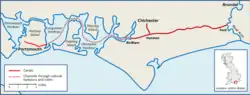 The Chichester Ship Canal ran East from the sea lock at Birdham to the junction of the Chichester and Arundel Canal (known more commonly as the Portsmouth & Arundel Canal) at Hunston and then north to a basin (Southgate Basin) in the south of the city of Chichester.[5]