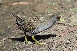 These birds are among the smaller members of their family, none being larger than a chicken and some really tiny, smaller than a starling or thrush. Their upperparts are a cryptic lighter or darker brownish hue. The underside is also brown in some, but more often buff or grey. Several species have patterns like whitish dots or black-and-white barred flanks, conspicuous close up, but at a distance providing additional camouflage in these birds' habitat. Some others are rather uniformly blackish-brown all over. The bill and feet are often brightly colored in red to yellow hues; the eyes' iris has some reddish-brownish hue, sometimes being bright red and also very conspicuous at close quarters. Porzana males and females generally differ barely if at all; in the little crake (P. parva), however, they differ so much they might be mistaken for separate species.[6]