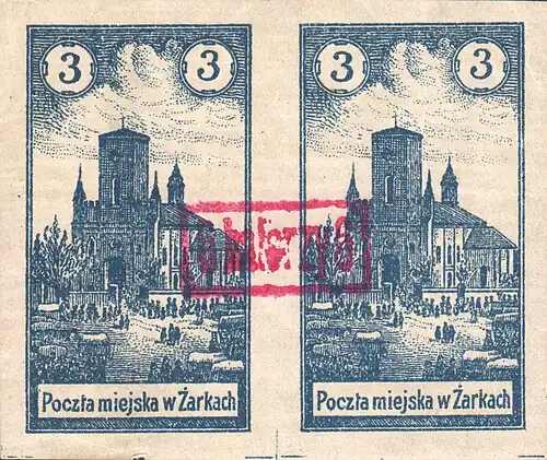 A local postal service briefly operated in the Polish town of Żarki during the month of October 1918. Postage stamps were issued, in one design but in three denominations denoted by different colouring. A set of forgeries was made in 1928. The stamps, both genuine and forged, have attracted philatelic attention.